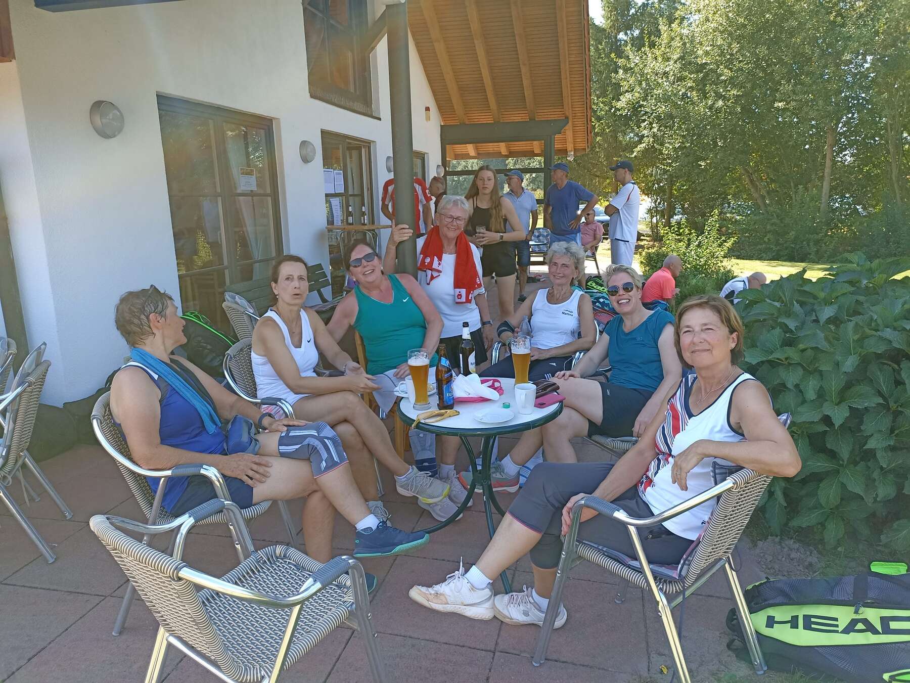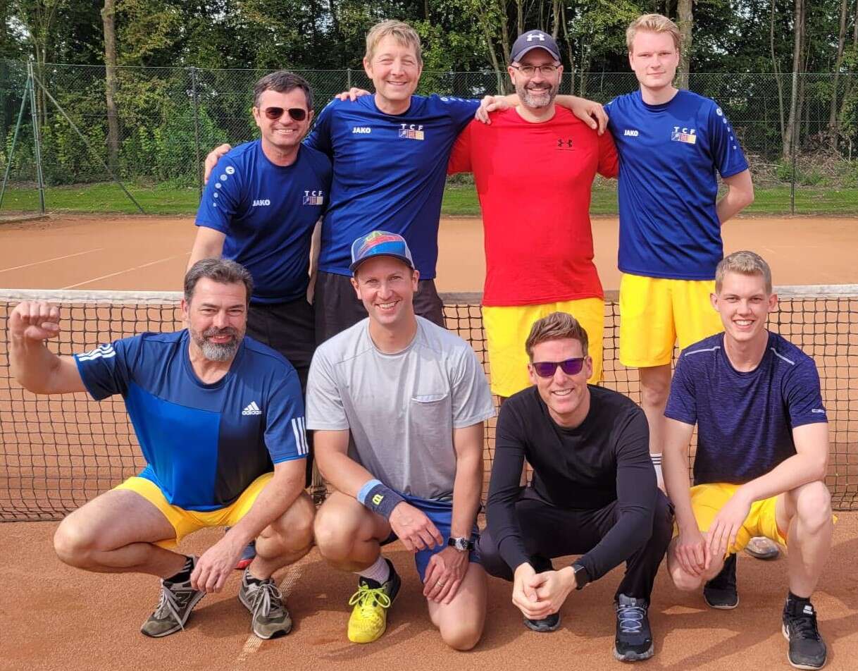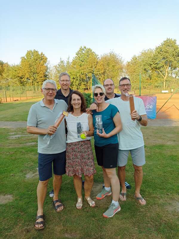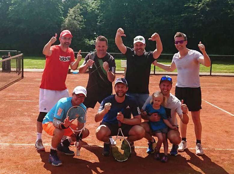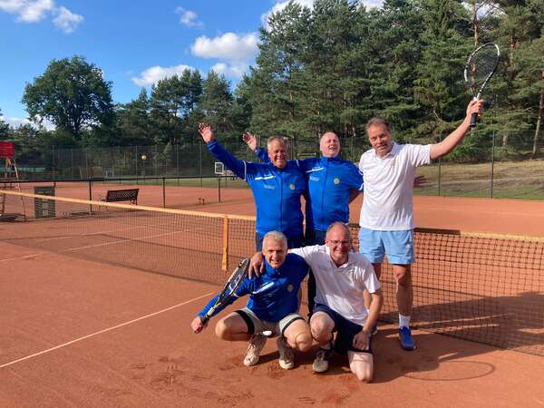 Jetzt haben es auch die Männer 50 geschafft: Der Titel in der Regionsklasse wurde mit satten 10:0-Punkten sicher eingefahren. Der 4:2-Sieg im letzten Spiel beim TC Ramelsloh hat Gewissheit darüber gegeben. Eigentlich wollten die 50ziger nur eine ordentliche Saison spielen. Doch mit den einzelnen Siegen ist die Gier nach dem großen Erfolg, sprich Meisterschaft, gewachsen. „Der TC Lühe und Ramelsloh war die Favoriten“, sagte Kapitän Jörg Kammann. Aber nach dem Sieg über Lühe witterten unsere Jungs Morgenluft. Trotz Corona und Verletzungen konnte Kammann immer eine schlagkräftige Mannschaft auf den Platz bringen. Allen voran Stefan Hanno, der mit 4 Einzel- und 4 Doppelsiegen glänzte. Auch Stefan Holst konnte, wenn er dabei war, im Einzel überzeugen. Als Doppelspezialisten entpuppten sich neben Hanno auch Joachim Nutbohm (5 Siege) ud Jörg Kammann (3). Heiko Wiebuch, Horst Hartwig, Ulf Mäcker und Ralf Preusker waren wichtige Stützen. „Wir wollen aufsteigen“, sagte Jörg Kammann nach erfolgreicher Meisterschaftsfeier auf dem Stader Weinfest.