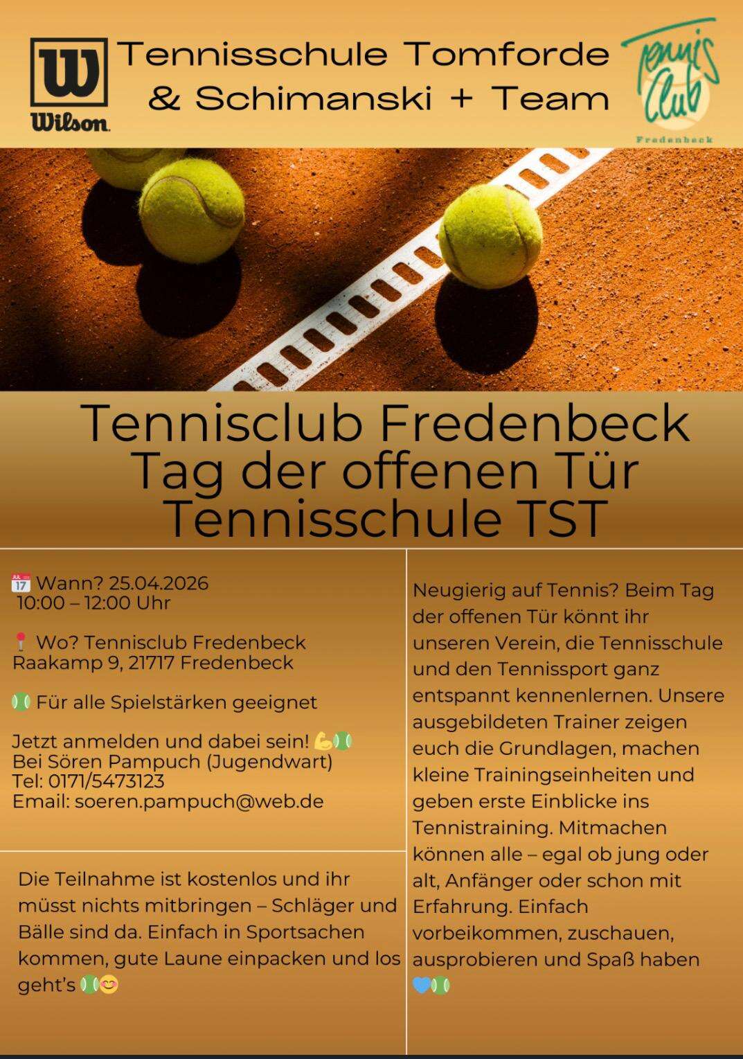 Am 25.April 2026 startet die Freiluftsaison mit einem Tag der offenen Tür. Tennis-Interessierte, Neueinsteiger oder Neugierige sind herzlich Willkommen, um den Verein, den Tennissport und die Tennisschule Tomforde & Schimanski + Team kennenzulernen!